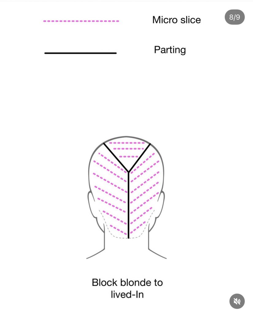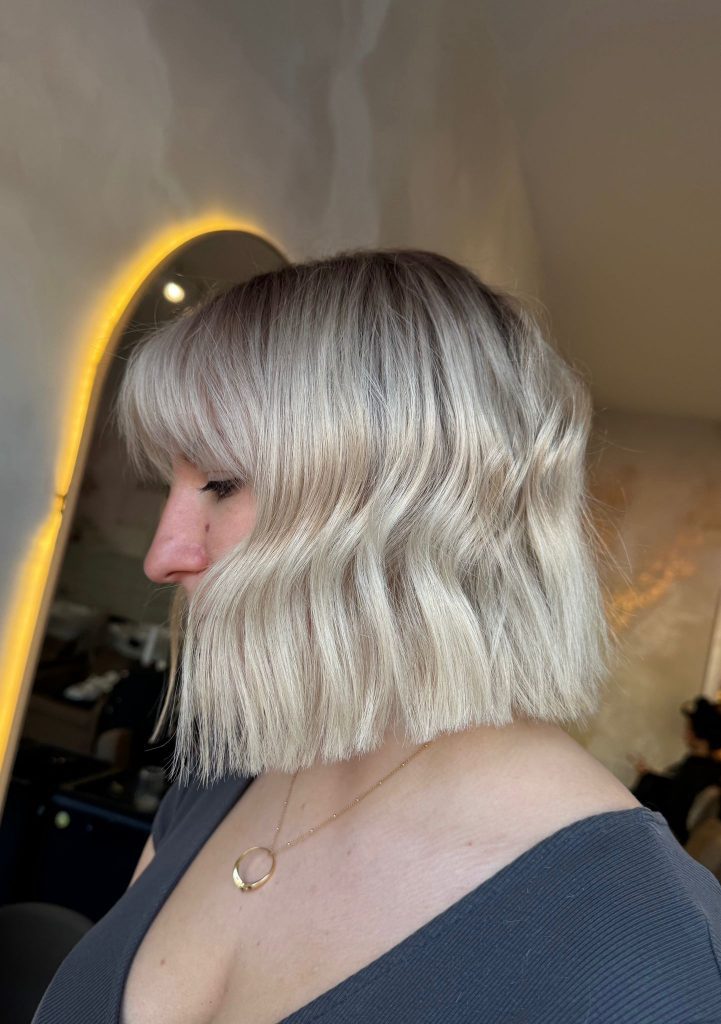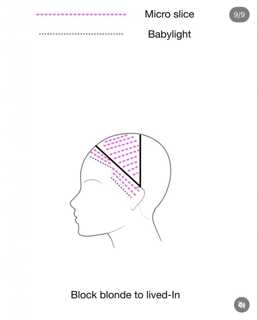 lifted cream blonde 3% on regrowth infinite blonde 2.25% mids/ends in-between colour 7.2 (pearl) toned regrowth 7.2 (pearl) mids/ends 10.7 (violet) & Clear